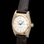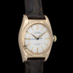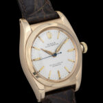 Rolex Oyster Perpetual Ref. 3131. Bubbleback - Ovettone - Gold 14Kt. N/S 413XXX. Affascinante Rolex Oyster Perpetual ref. 3131, iconico “Bubbleback” in oro 14 carati, uno dei modelli più rappresentativi della produzione Rolex anni ’40. Cassa cosiddetta “ovettone” in oro 14kt con linee morbide e proporzioni classiche, che conferiscono al segnatempo una presenza elegante e senza tempo. Il fondello bombato tipico dei Bubbleback custodisce il celebre movimento automatico Rolex, tra i primi automatici di manifattura. Quadrante argento con indici applicati in oro e sfere originali in stile dauphine. Scritte “Rolex Oyster Perpetual”. “Officially Certified Chronometer”. Il quadrante presenta una patina naturale coerente con l’età dell’orologio, che ne valorizza il fascino vintage. Corona originale Oyster. Cinturino in pelle marrone (non originale Rolex). Carica: Automatica. Movimento: Rolex automatico Bubbleback Diametro: circa 32 mm (senza corona). Periodo: anni ’40. Orologio dal grande valore collezionistico, sempre più ricercato dagli appassionati di Rolex vintage per la sua importanza storica e per la produzione limitata rispetto ai modelli successivi. Importante è comprare bene, non decidere solo sulla base del costo, ma dare importanza alla qualità e alla coevità. Compra, cura ed ama il tuo segnatempo! "Orologi Vintage, l'Arte del Tempo! "