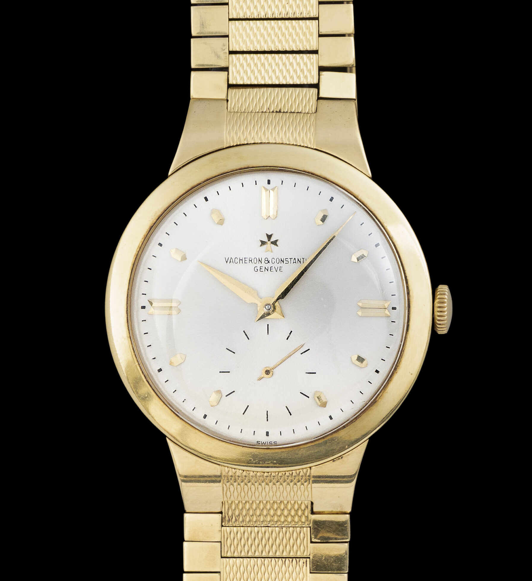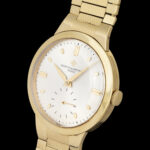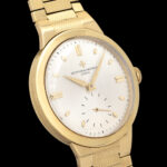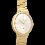 Vacheron Constantin Geneve. Scatola originale dell'epoca. Chronometre Royal Ref. 6075. Museum Conditions. 18 Kt. Yellow Gold. N/S 356XXX. Anni 50'. 35 mm. Cassa in oro giallo 18 kt con fondello a pressione. Quadrante argentato soleil con grafica indelebile, indici applicati e secondi al 6. Movimento meccanico manuale cal. P1007/BS numero 507806. Bracciale in oro giallo 18 KT. Lunghezza bracciale in oro, con maglie lavorate, di circa 19.5 cm. Noto per precisione e affidabilità. Tutte le parti sono firmate (quadrante, cassa, movimento e bracciale). Orologio di grande eleganza e collezionabilità. Comprare un orologio deve essere un piacere, comprarlo "giusto" deve essere un dovere. Importante è comprare bene, non decidere solo sulla base del costo, ma dare importanza alla qualità e alla coevità. Compra, cura ed ama il tuo segnatempo! Valutiamo permute.